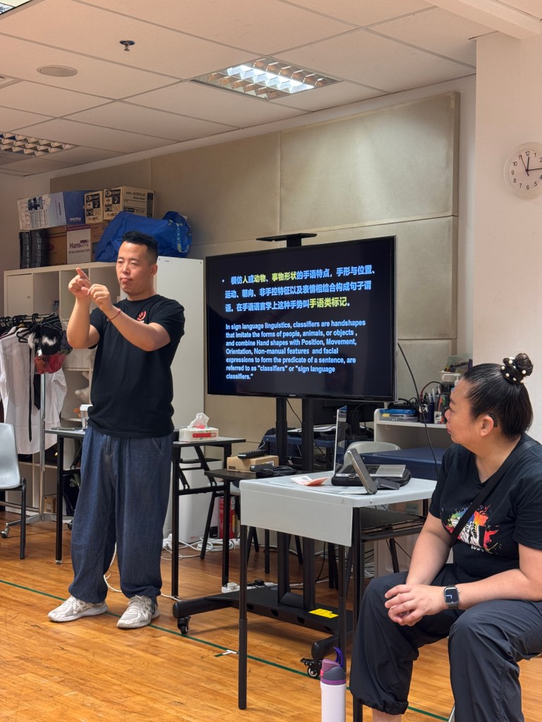 The workshop was led by Xue Fei, a Deaf trainer from China, who guided us through the rich expressive and cinematic world of Visual Vernacular. VV is a performance art that blends creative handshapes, body movement, facial expressions, and cinematic storytelling – without the need for voice or spoken language.